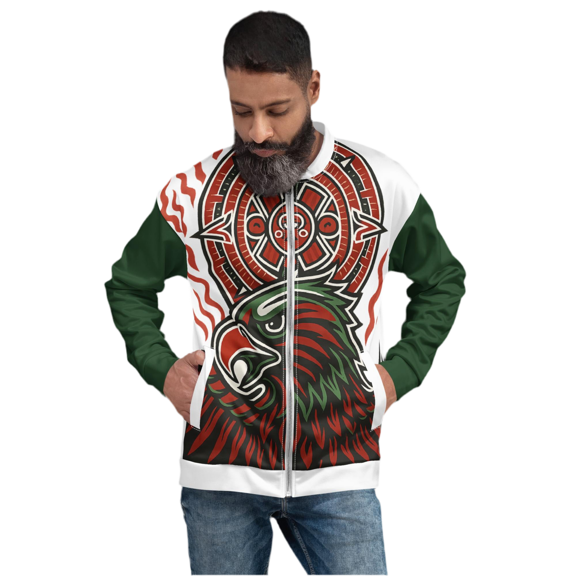 Unleash your inner warrior with our Aztec Eagle Power Bomber Jacket. Featuring a striking fusion of modern streetwear and ancient heritage, this jacket showcases a bold eagle design inspired by Aztec iconography, paired with powerful red, black, and green tones. The detailed sun calendar and fiery accents pay homage to rich indigenous roots, making this more than a jacket it's a statement of strength, culture, and pride. Perfect for making a bold entrance, repping your roots, or standing out with fearless style.
