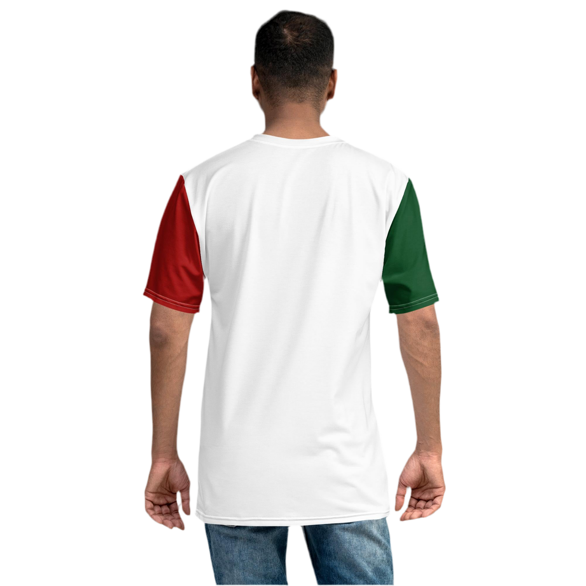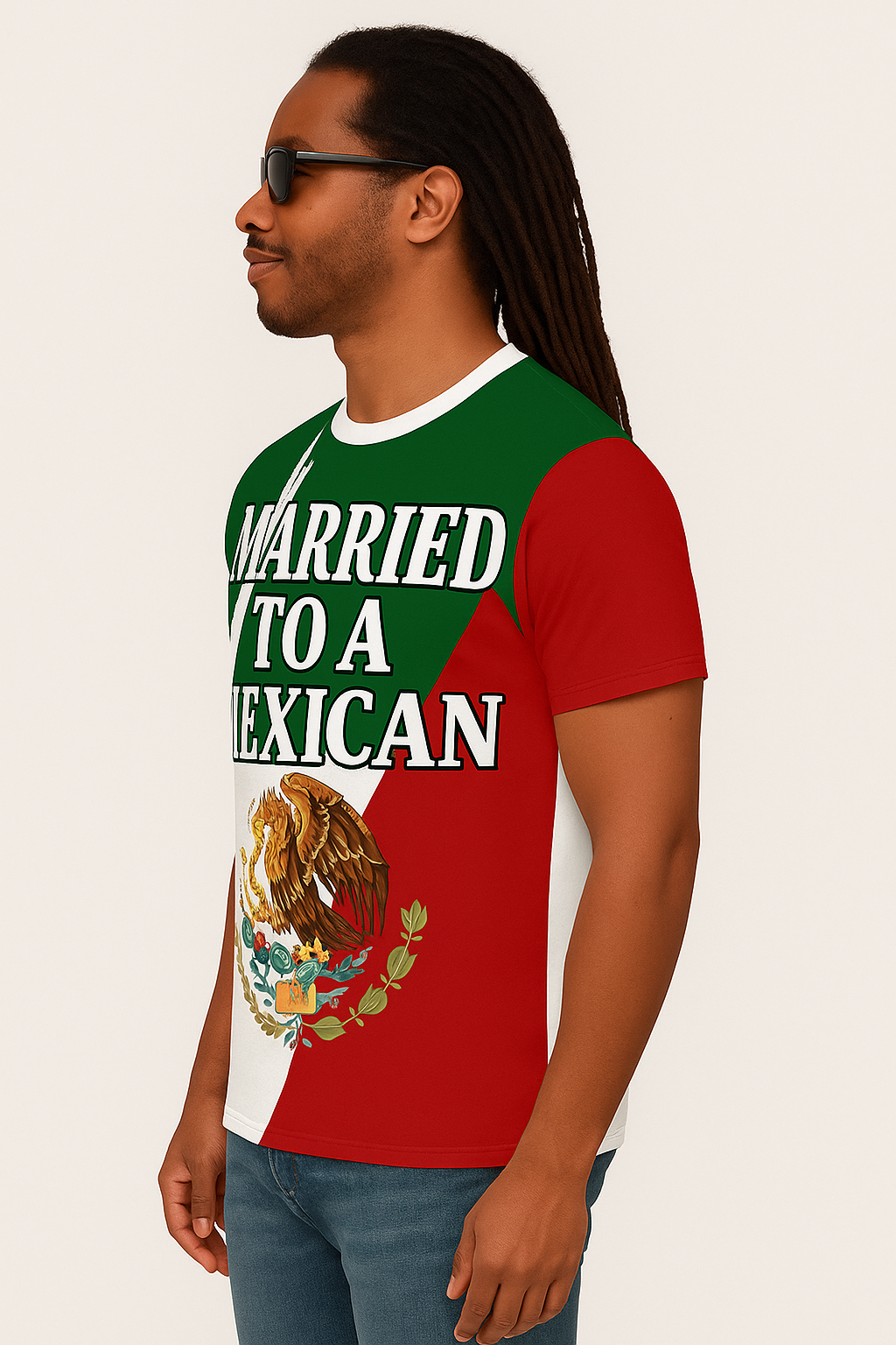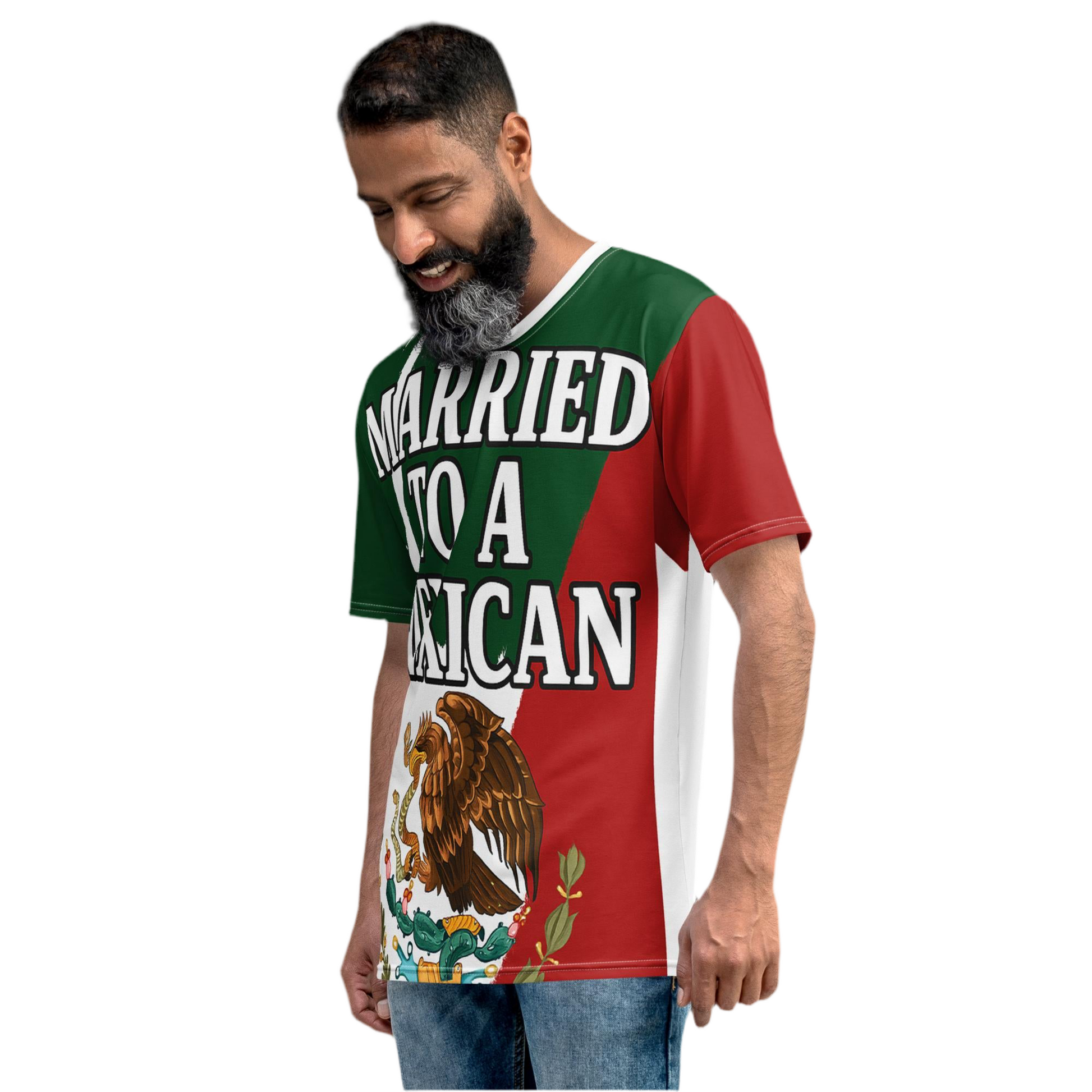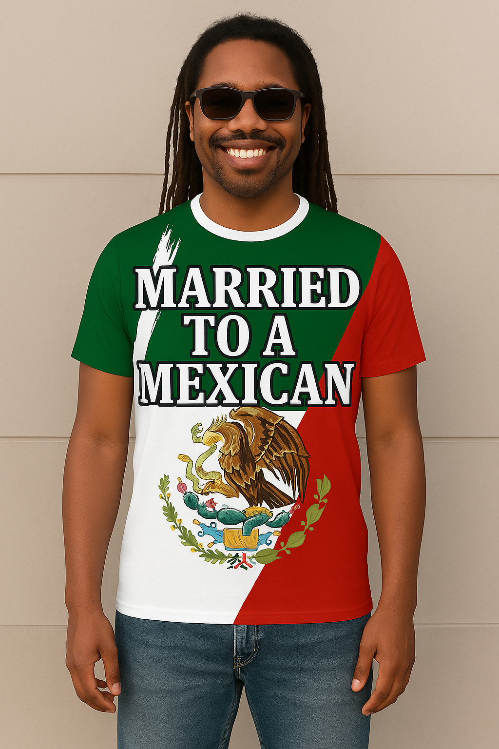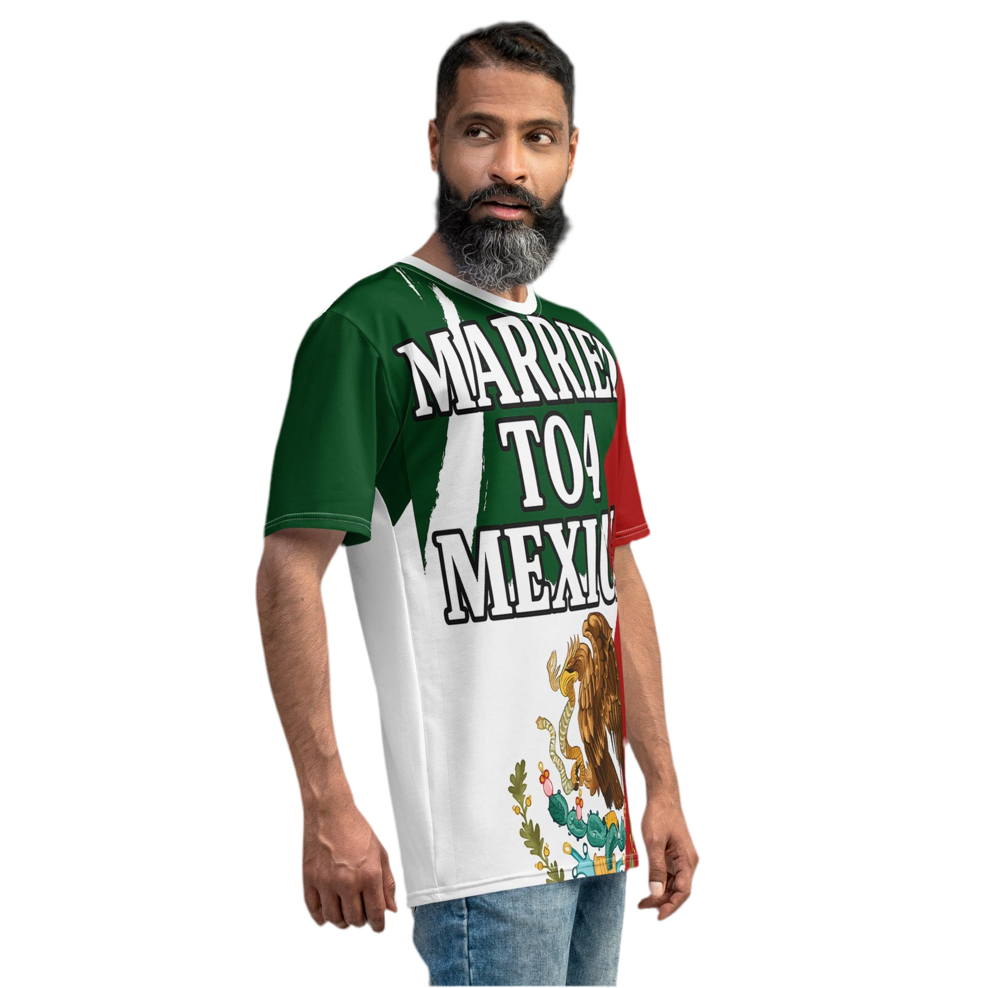This all over print men’s shirt features the iconic colors of the Mexican flag with powerful “Married to a Mexican” lettering across the chest and the legendary eagle emblem below. Finished with a clean crew neck, green and red sleeves, and a pure white back for contrast it’s not just a shirt, it’s a love story you wear.